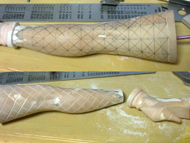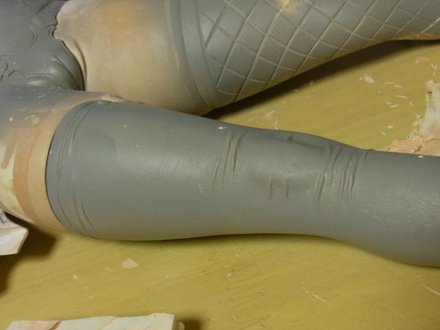 左脚の網タイツに着手。最初に格子模様を描いてそれをガイドにして斜めのラインを描きました。んでナイフで彫りました。