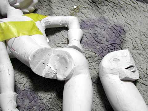 膝の上下でぶった切った後、とりあえず瞬着でとめてます。あとから接合ラインをV字に彫って