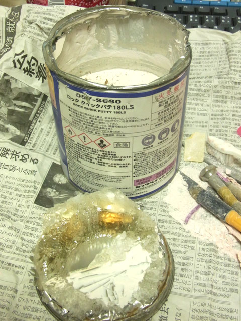 ←ポリパテの缶の蓋が全然取れなくて最終的に破壊するの図。蓋の裏に透明の結晶ができてました。パテは溶剤が飛んでファンド位の固さになっておりました。