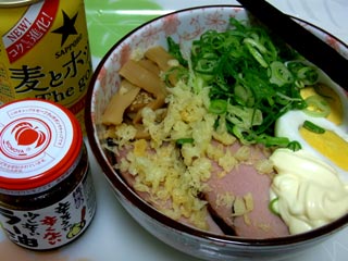 最近はスーパーのラーメン(生麺)のコーナーに色々な商品が並んでいてどれにしようか迷います。今日は味噌ラーメンにいろいろ乗せました。