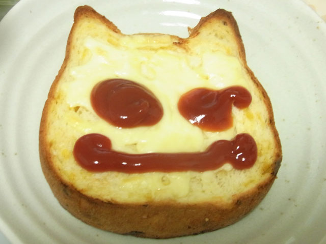 職場の近所のパン屋さんに最近行列ができます。猫の形の食パンでした。チーズ入りのを買ってみましたよ。