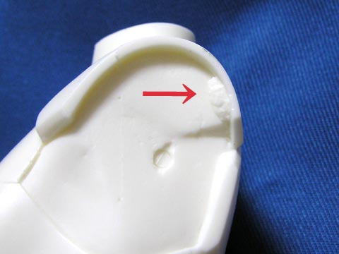 胴体パーツの腕の取り付け基部はテストショットの時点でゴムがもげた(TnT)のでもれなく不要部分のオマケ付きとなっております。