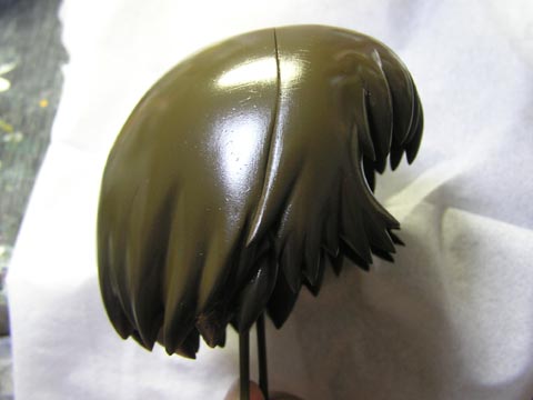 先に暗い茶色を塗って、乾燥したら前髪と後頭部パーツを両面テープなどで仮組みします。 それから明るい茶色を塗れば、パーツの継ぎ目で微妙に色が違ったりという事がないです。