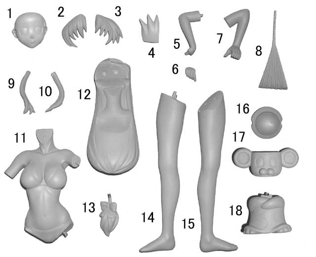 あとは塗装して接着すれば完成です。 顔、髪、胴体、もみあげの4パーツは互いに干渉するので、接着前に仮組みして位置を確認して下され。