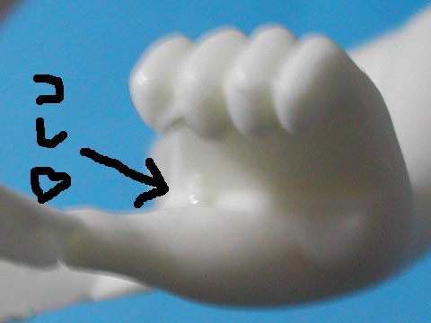 キットの状態だと左手の親指の付け根のあたりでゴムが食われている為きつくて嵌りませんので、