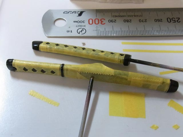 刀と脇差の柄の菱形の部分はこんな感じにマスキングしました。ピンセットや楊枝などで菱形の凹みをなぞってからナイフで切ってます。