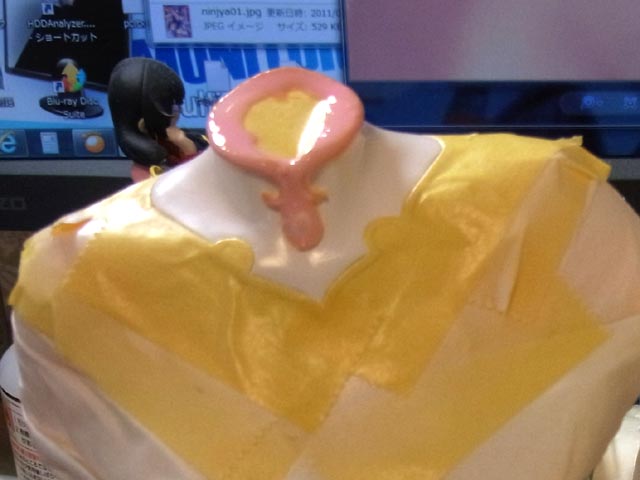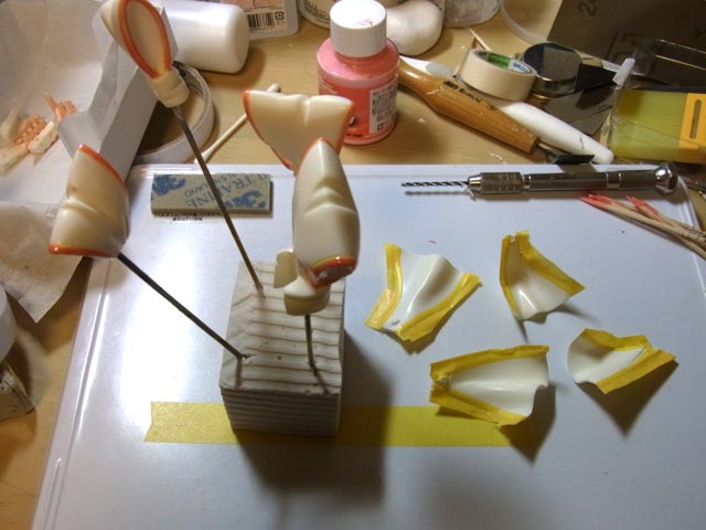 マスキング風景。ひらひらの部分は割り箸に両面テープで固定して塗装しました。あまり強力なテープだと塗膜をもっていかれるので要注意です。