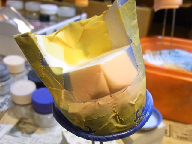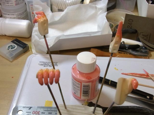 指パーツのマスキング風景。指の根元にテープをくるっと巻いて、そこから先ははゾルを塗ってます。