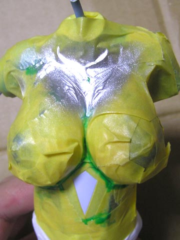 マントやローブの白の部分をマスキングして緑を吹きます。