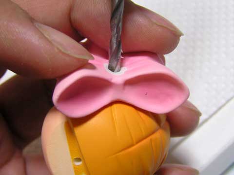 次に頭部パーツにぴったり合わせて頭部にも穴を開け、3mmアルミ線を差し込んで接着します。