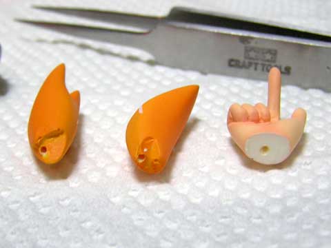 アルミ線の跡がパーツ上部のキワに跡がある方が右のおさげ(ややこしいですが画像では左の方)、やや下に跡がある方が左のおさげ(画像では右側)です。