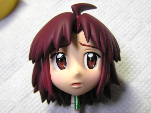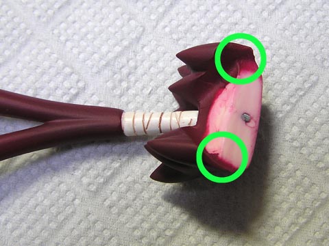 瞬着で接着する場合は丸印のトコが顔パーツと密着するので、もっと塗料を落としておいた方が良いです。 画像で塗料を落としてあるトコはヒケてて密着しないので(笑)