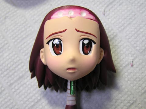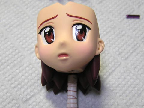ここは下地処理の段階で、こめかみの辺りで軸打ちしておいて、前髪を接着する前にもみあげを顔パーツに差し込めるようにしとくのが一番良いと思います。 俺は面倒臭かったので端折りました。