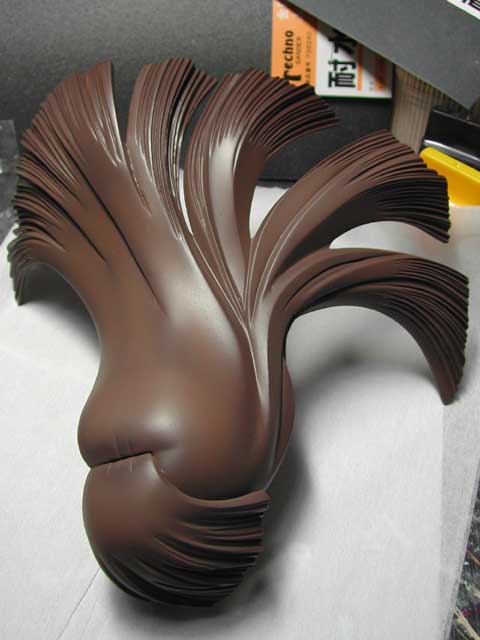 顔パーツにシャドウ吹いたら、ウッドブラウン+マホガニーでハイライト。