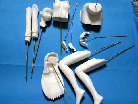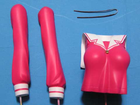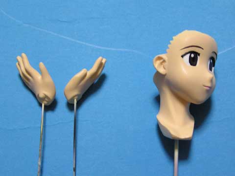 上半身は髪の毛に顔を接着→胴体に頭部を接着→眼鏡装着→前髪接着、という順番で組み立てます。 両腕には手を接着しておきます。スカートには両足を接着しておきます。