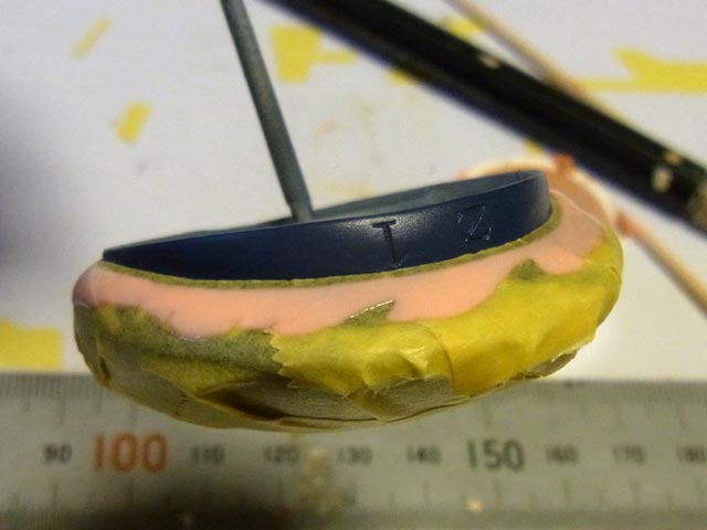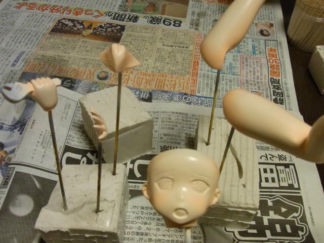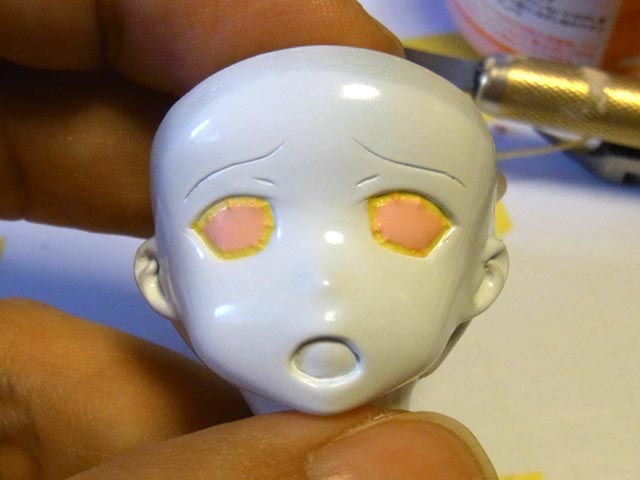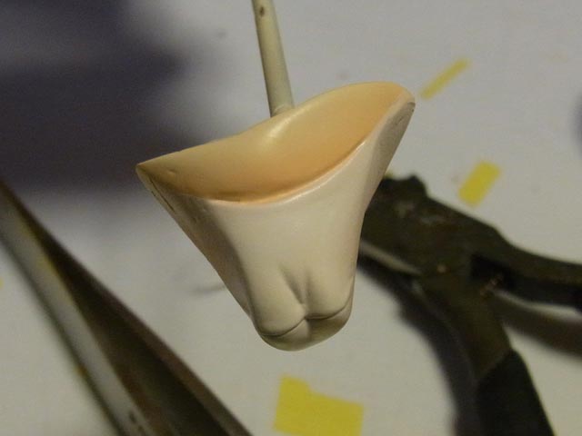 肌色を吹きます。凹みや影になる部分などはピンクっぽい肌色を吹きました。
