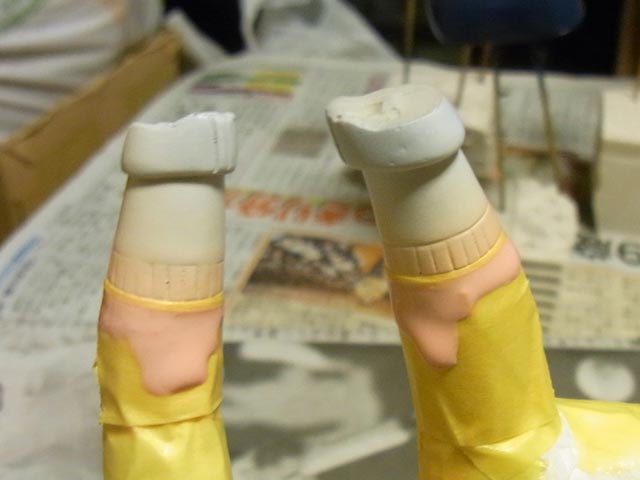 服の色が暗くて継ぎ目はあまり目立たないので継ぎ目消しはせずに普通に塗装後に接着するだけでも良いと思います。
