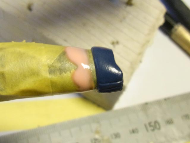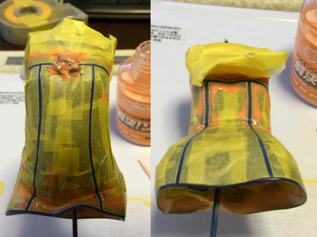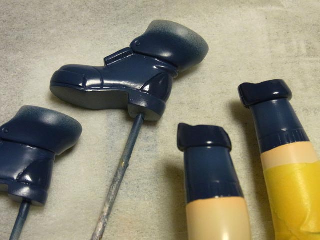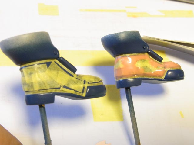 次に靴の濃い色の部分を塗る為に靴下をマスキング。