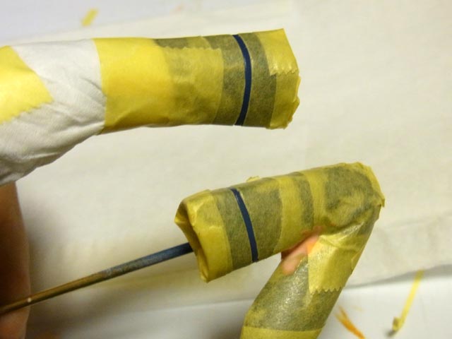 作例では服のラインを後から塗りますが、先に塗ってマスキングしても良いです。 その方がマスキングテープはちょっとで済みますね(笑) ラインだけ筆塗りという手もあります。