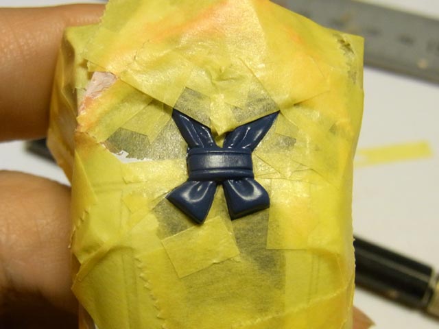 胸元のリボンもマスキング。写真がないけど、帽子のリボンも一緒に塗ります。