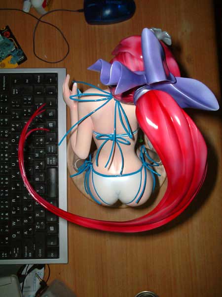 塗装ですが肌はキャラクターフレッシュ2にてシャドー部分を先に塗装後、 メインの肌色をキャラクターフレッシュ1にて塗装、 そしてシャドーとの境界線部分を滑らかな色合いにするためもう一度メインの肌色をシャドー部分ごと全体に軽く様子を見ながら塗装しました。 髪の毛はマルーン+パープルを混合してメイン塗装、ハイライト部分はホワイトを、 そして二つの色をなじませるためにマルーンを全体に塗装してます。 水着はスカイブルーをシャドーに、メインの水着をホワイトで塗装、 そのあとまた全体にホワイトを塗装、その上からホワイトパール+クリアーを塗装してます。 リボンはパープルの上にホワイトパールです。